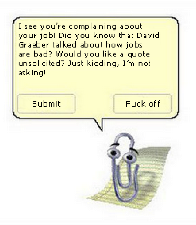 To some extent, it feels like Bullshit Jobs isn't working that way, at least not anymore. When they're casually dropped in every thread about a vaguely work-related complaint, it feels more like a method of silencing or sidelining people and their burgeoning ideas, even when it feels like tacit agreement with their complaints. It's as if people are being repeatedly told that their own ideas, frustrations, and opinions don't even matter: "That has already been said! Look, David Graeber commented on it!"